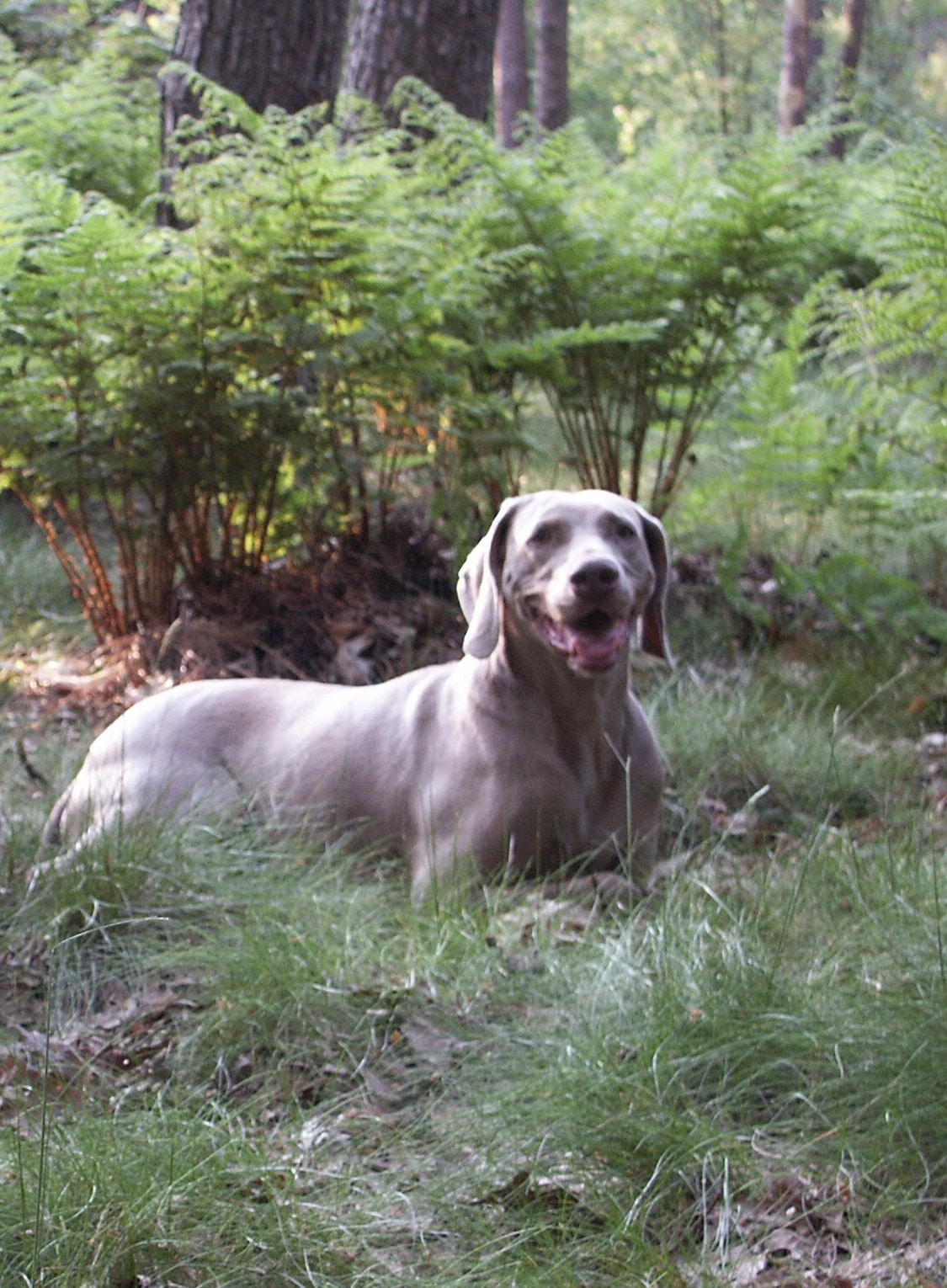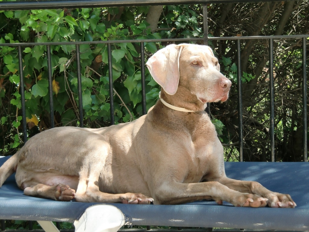 Kyra was in alle opzichten een èchte dame ! Zij liep om plassen heen (niet erdoor) en bij ons tegen onze benen geplakt onder de paraplu als het regende ! Ze had er een hekel aan als ze ‘vies’ werd en was ontzettend proper op zichzelf. Ze ging ook altijd in een ‘adelijke’ (weimaranereigen verwaande) houding liggen met haar voorpoten sierlijk over elkaar heen en straalde alle elegantie uit…